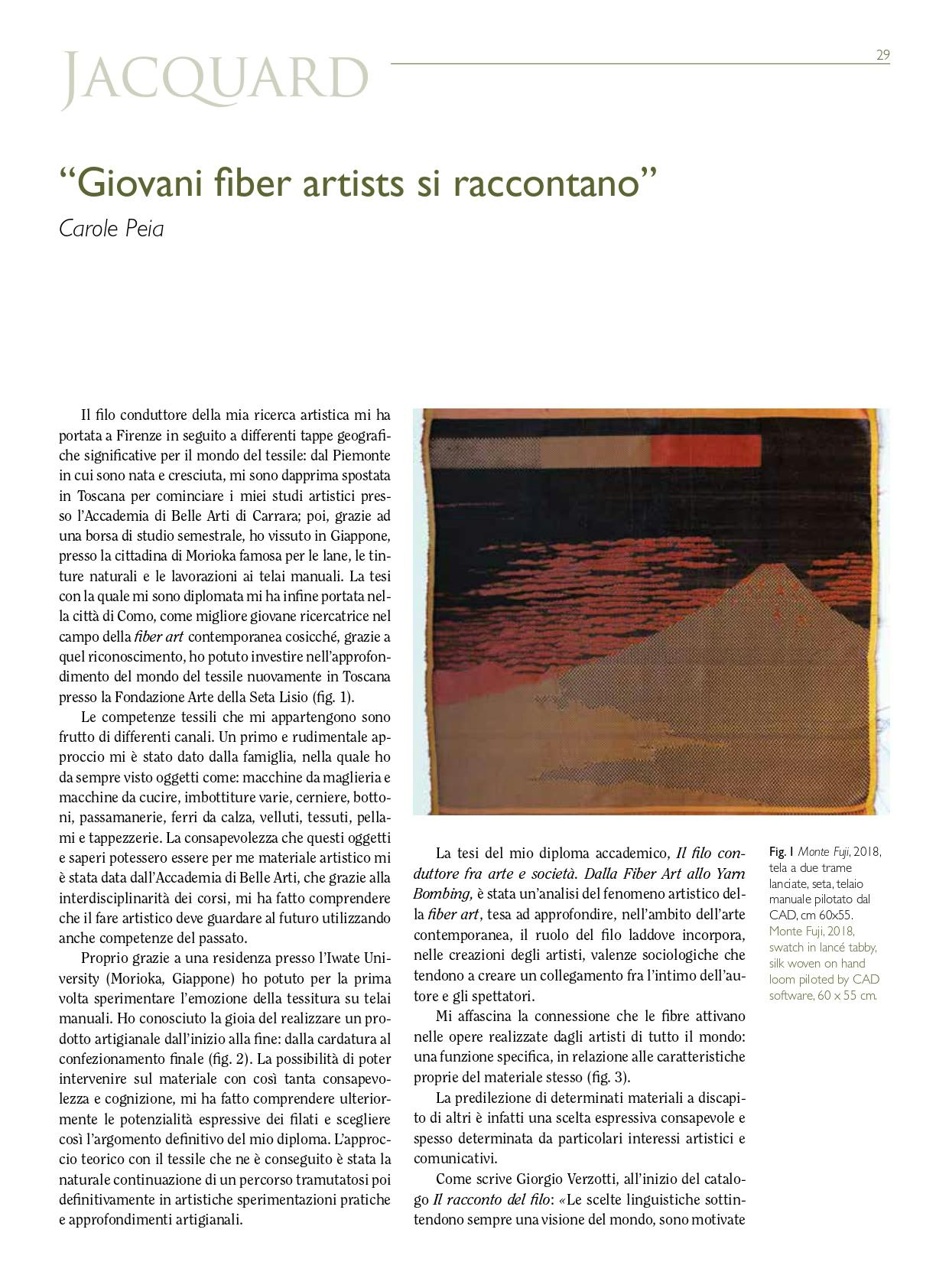 Carole Peia, a young fibre artist, tells us about her life and work, and how her decision to produce her art in fibre was dictated by a need to experiment and to find new rhythms, colours and forms in a union of the world of sculpture with that of textile materials.