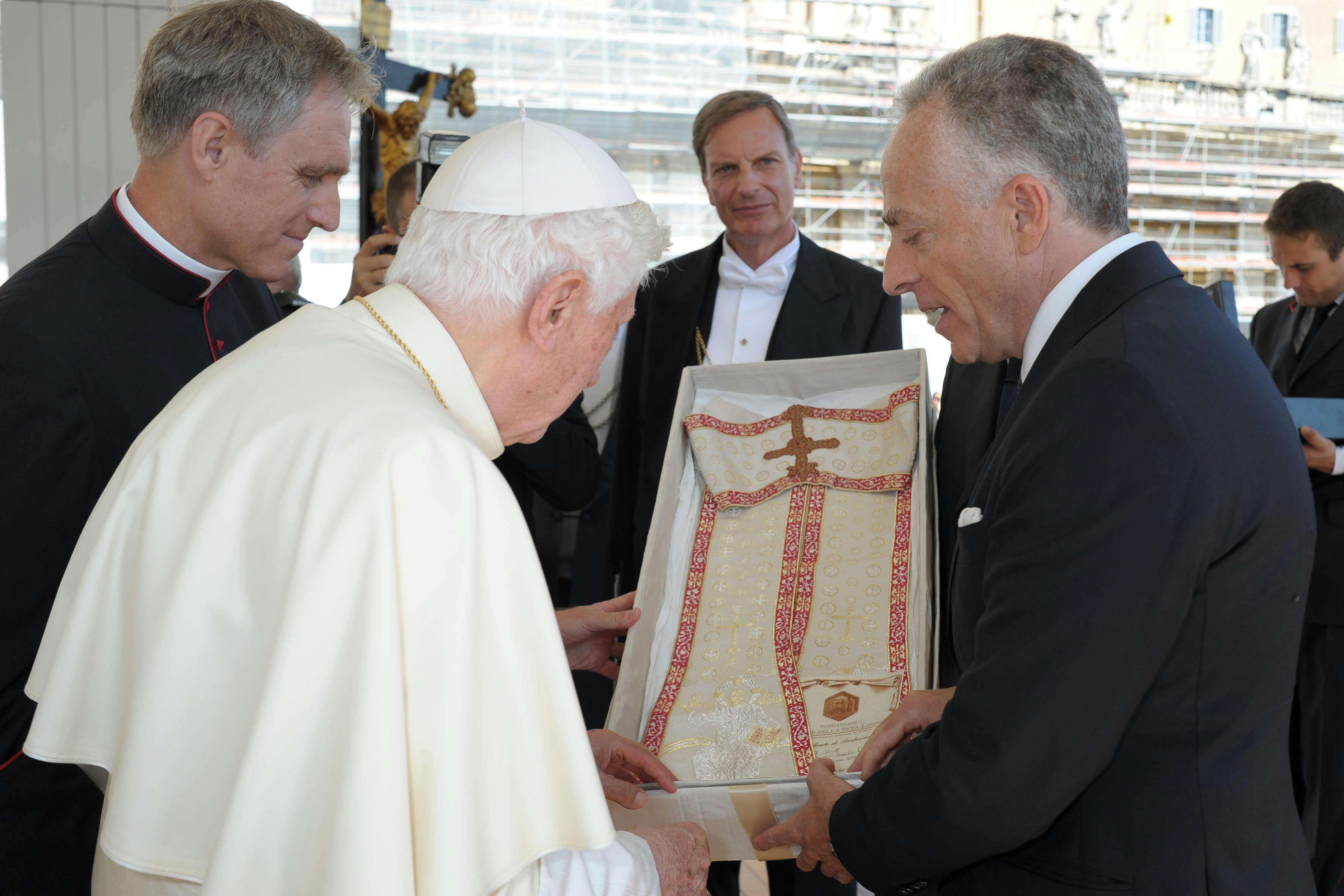 The design, the subject of which is Christ Pantocrator, reproduces the centre portion of a fabric put into production in late 1926 by Giuseppe Lisio, who called it ‘Dalmatica’. He drew his inspiration from the so-called Dalmatic of Charlemagne, now in the Vatican Museums, a Byzantine embroidered work from the 9th-10th century representing Christ amidst a host of angels and saints.