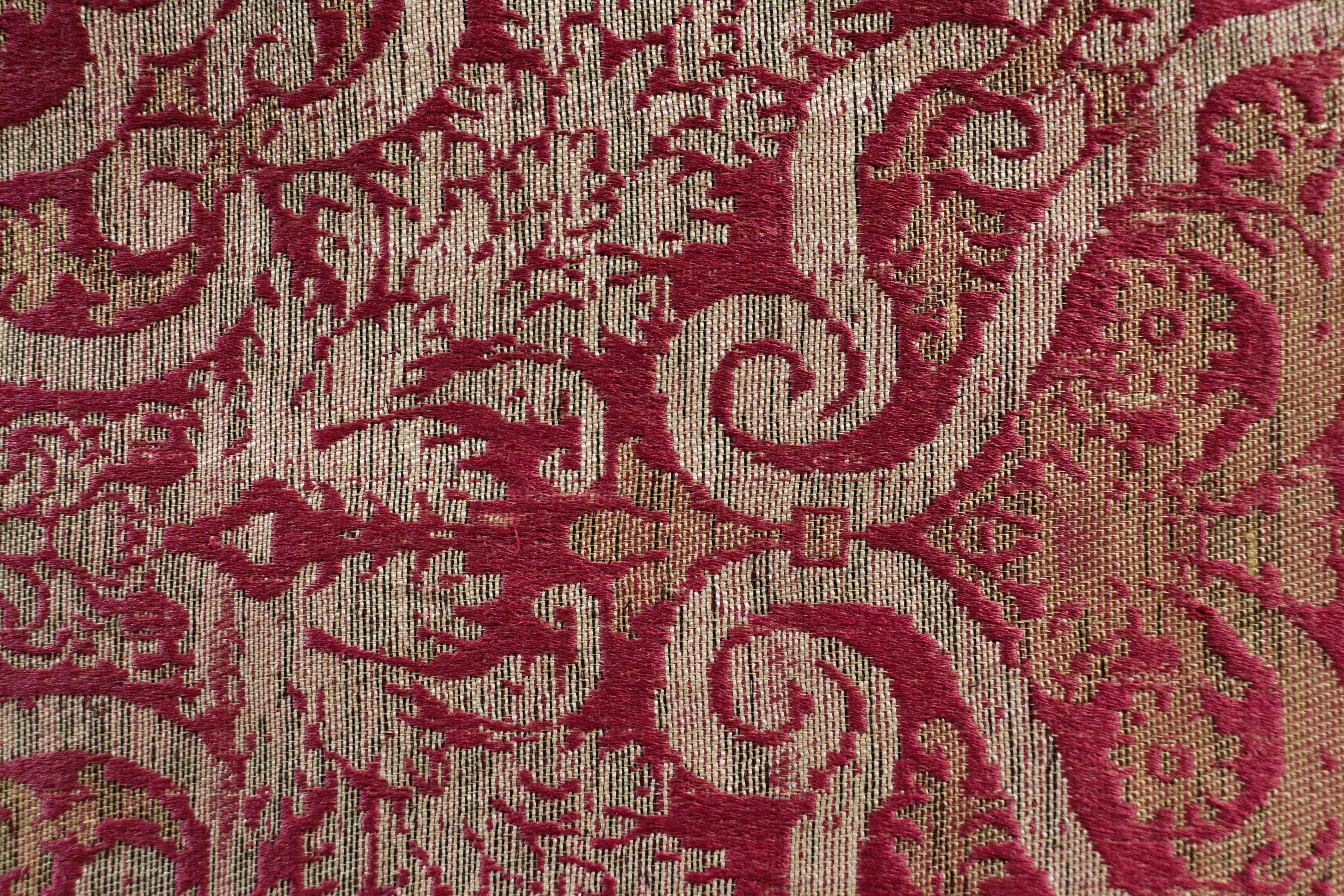 Il tessuto fa parte di una produzione fiorentina databile tra il 1530 e il 1550. Il disegno è caratterizzato da un impianto grafico a maglie chiuse con al centro una pigna, molto diffuso a partire dalla fine del XV secolo. Le ghirlande che definiscono le maglie racchiudono motivi a quattro doppie volute che fanno da cornici alle pigne. Questo tipo di disegno veniva realizzato in tecniche molto sontuose, come rasi in seta broccati in oro e argento oppure broccatelli. Il tessuto esposto è in broccatello, una tecnica tessile molto diffusa che utilizza seta e lino in trama: dà rilievo ai disegni e permette anche di contenere i costi di produzione. In questo caso è presente anche una trama in laminetta d’argento che conferisce luminosità all’insieme. La traduzione di questo disegno in velluto è avvenuta nel 1909 da parte dell’Arte della Seta Lisio di Firenze.