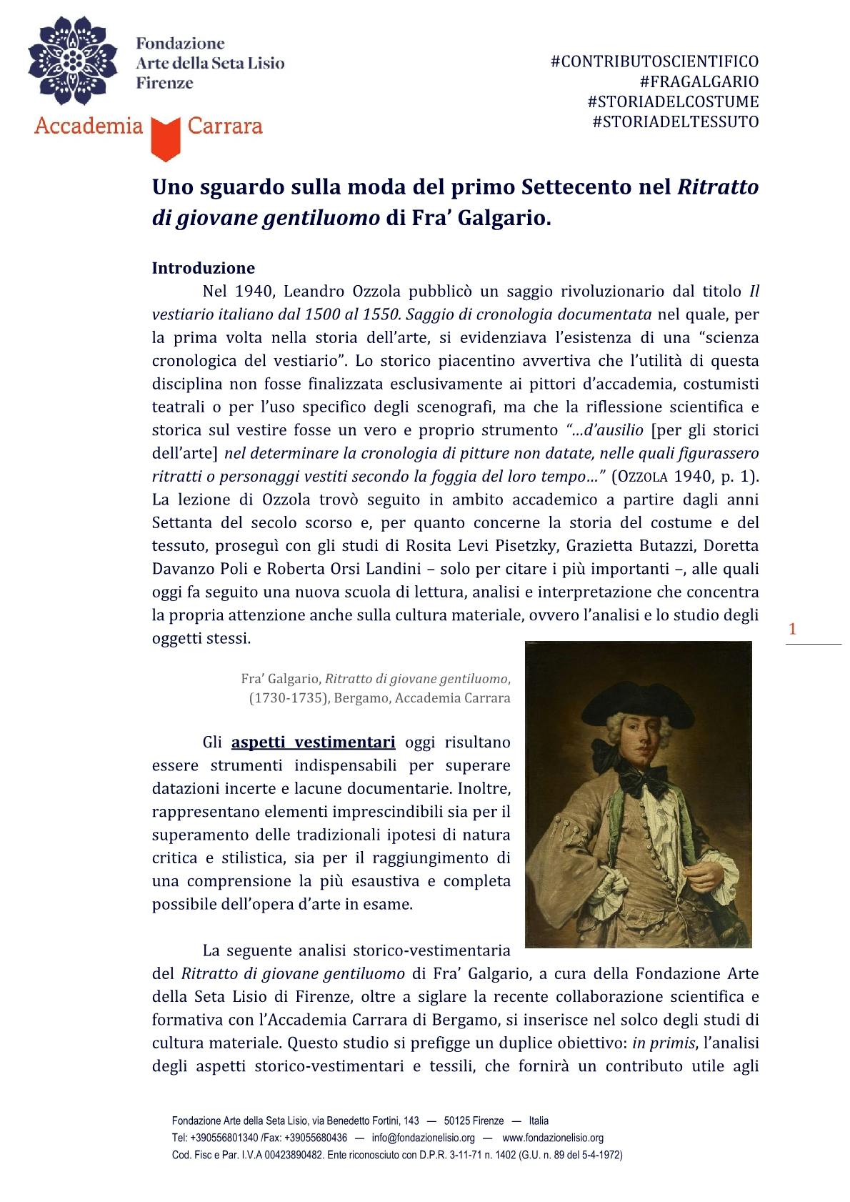 La seguente analisi storico-vestimentaria del Ritratto di giovane gentiluomo di Fra’ Galgario, a cura della Fondazione Arte della Seta Lisio di Firenze, oltre a siglare la recente collaborazione scientifica e formativa con l’Accademia Carrara di Bergamo, si inserisce nel solco degli studi di cultura materiale. Questo studio si prefigge un duplice obiettivo: in primis, l’analisi degli aspetti storico-vestimentari e tessili, che fornirà un contributo utile agli storici dell’arte per la determinazione degli aspetti storico-artistici strettamente legati al ritratto in oggetto; deinde, la riflessione in merito all’importanza della storia del costume e del tessuto in area bergamasca, al fine di giungere ad un’interpretazione il più completa possibile e, conseguentemente, favorendo un dibattito accademico proficuo.