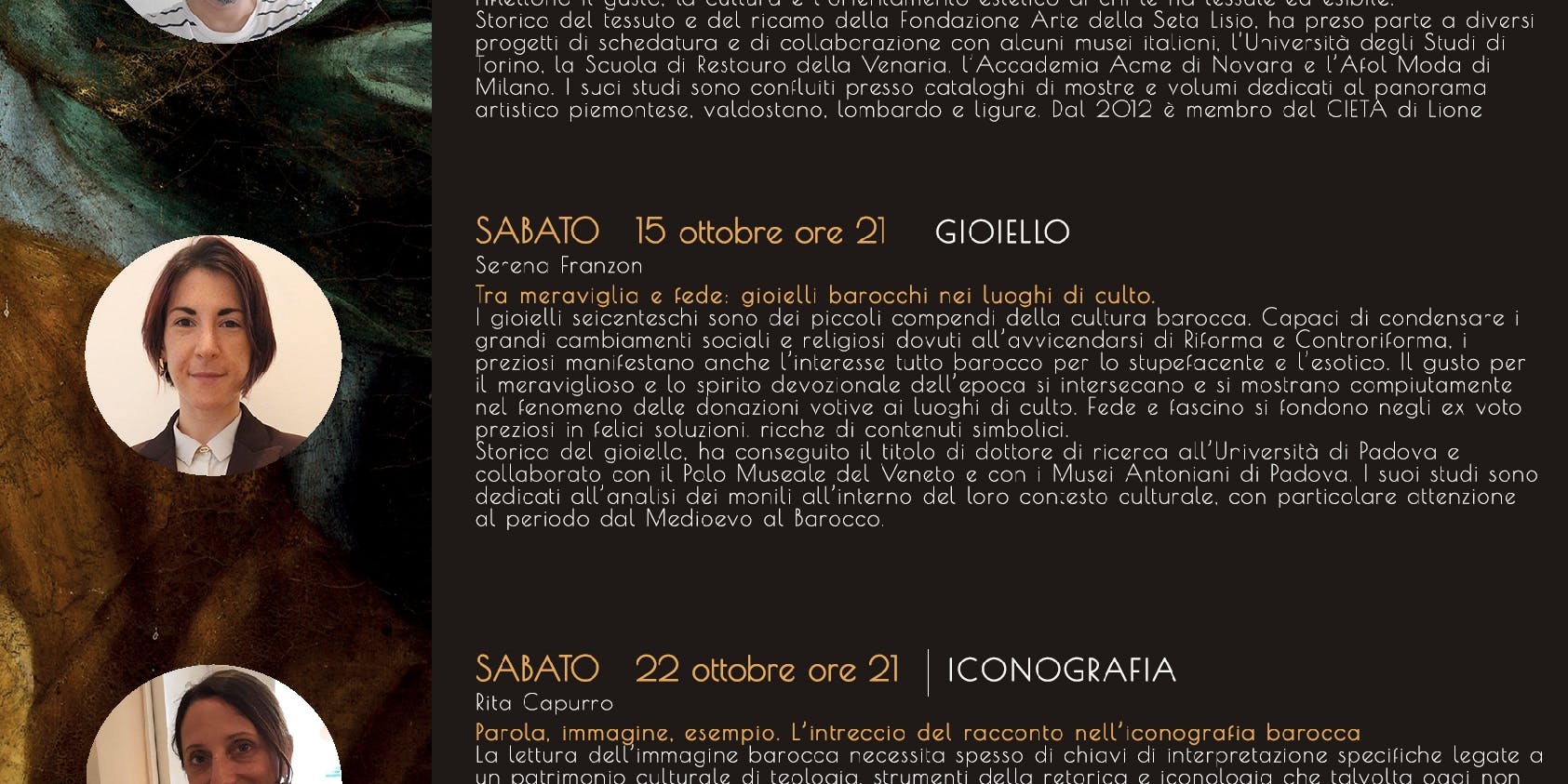 Nell'ambito del progetto di divulgazione Diocesano Formae Lucis, e contestualmente alla mostra "ONDE BAROCCHE. CAPOLAVORI DIOCESANI TRA 1600 E 1750" la Fondazione arte della Seta LISIO e Formae Lucis presentano: "TRAME BAROCCHE, tra tessuto e iconografia per svelarne i significati", un ciclo di incontri di approfondimento su temi legati al periodo barocco e tardo barocco.