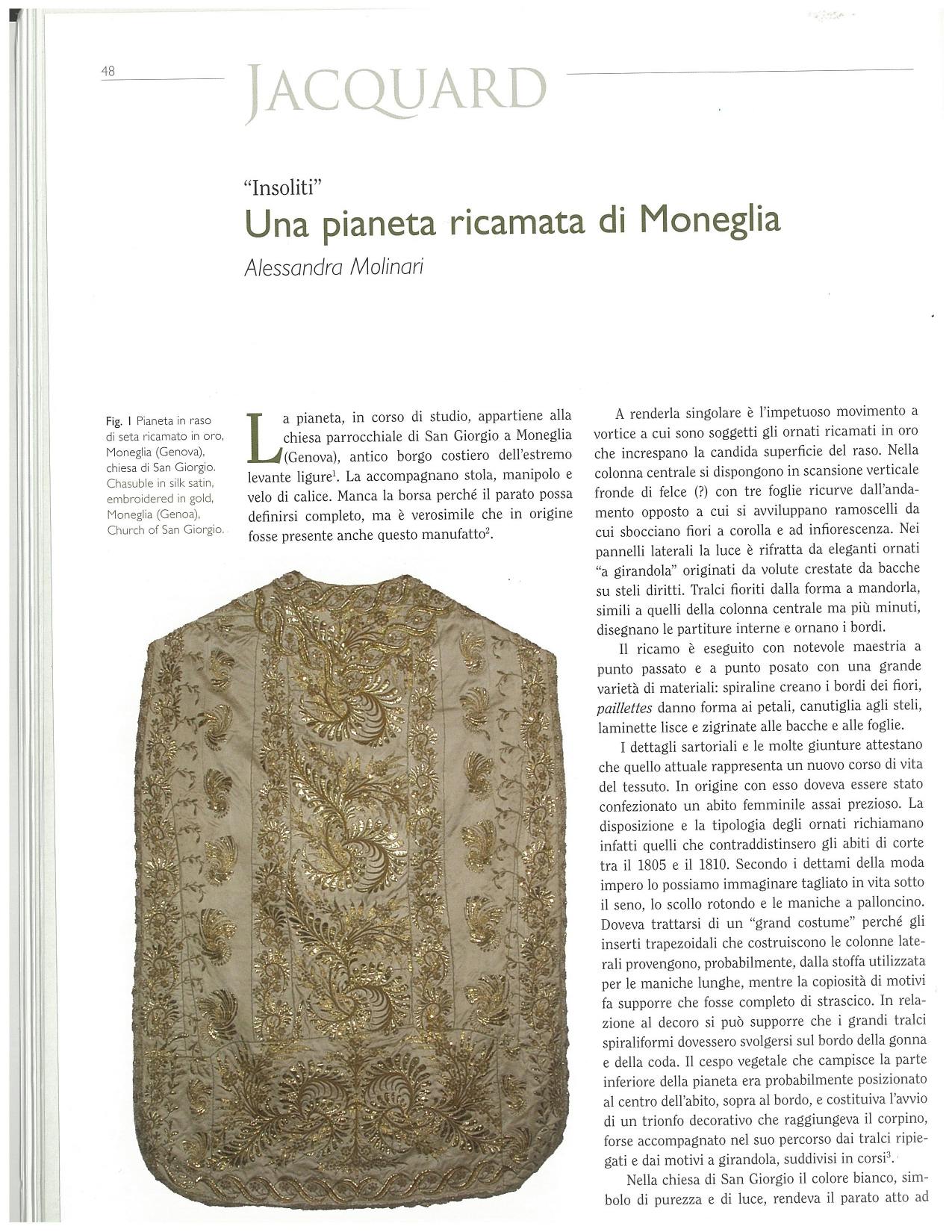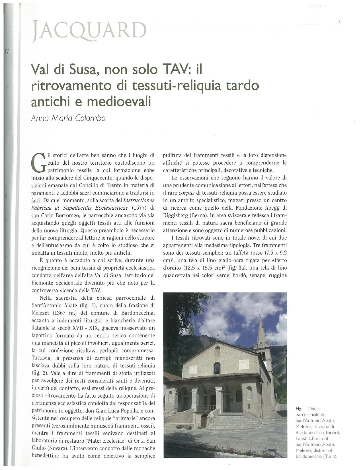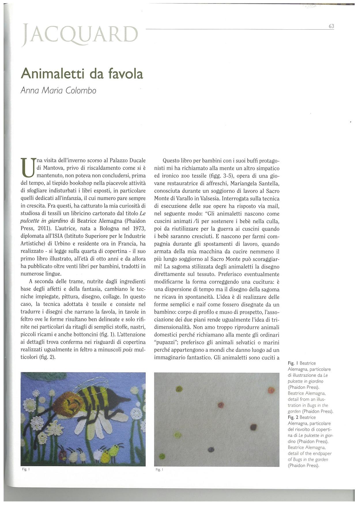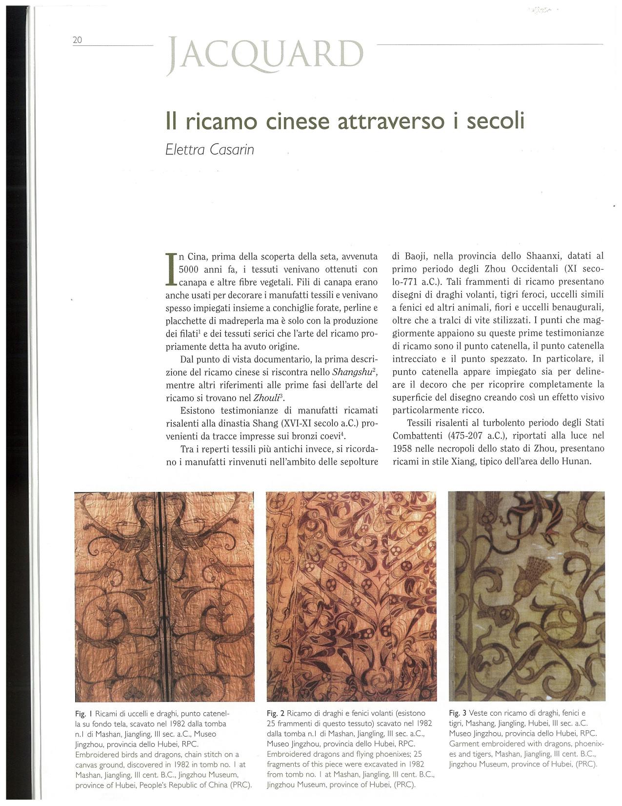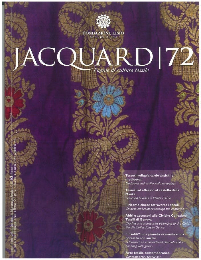 In the issue we have the discovery of relic-textiles dating back to the late ancient and medieval periods. The parade of heroes and heroines in the frescoes of the Manta castle attracts attention due to the fabrics depicted and the comparisons with the remaining examples of the time. Moving to China, the evolution of the art of embroidery has changed techniques and uses over the centuries. The theme of travel is the common thread that links clothes and accessories from Asia and Eastern Europe and donated to the Civic Textile Collections of Genoa. The "unusual" section includes two particular pieces: a gold-embroidered chasuble from the early 19th century and an embroidered handbag from the late 1800s with a "surprise". The notes on the textile design conducted in the Lisio Foundation concern a multiple fabric made with a digital loom, while the artist Maria Luisa Malerba presents her works that express the colors of the sea. Closing are the characters of fairy tales told in felt and fantastic little animals born from a lively imagination and a strong sensitivity for the recovery of materials.
