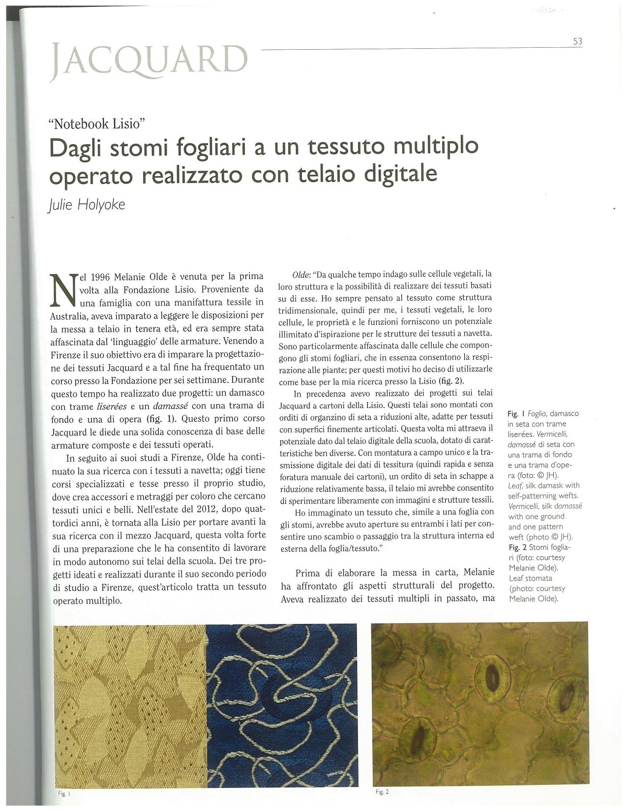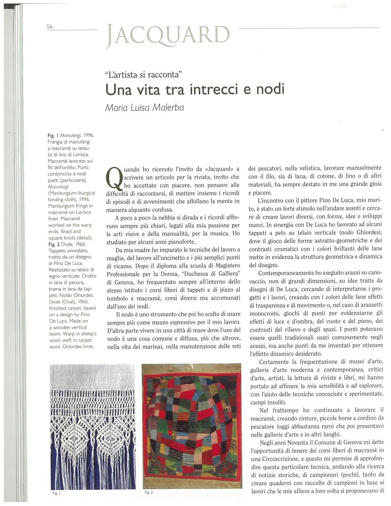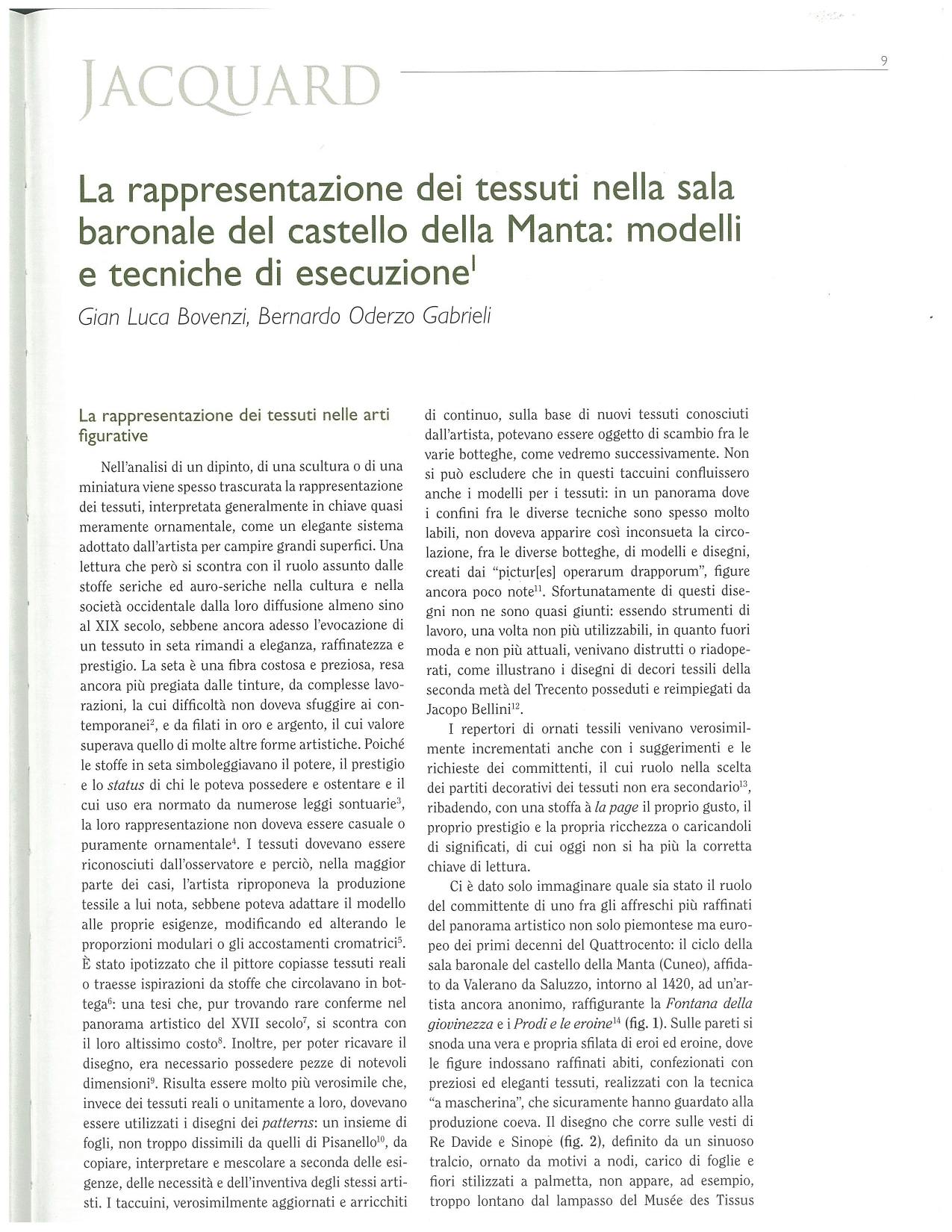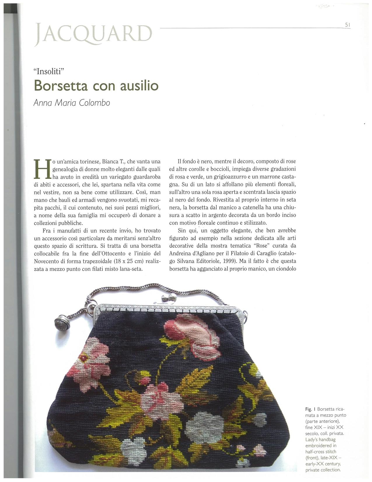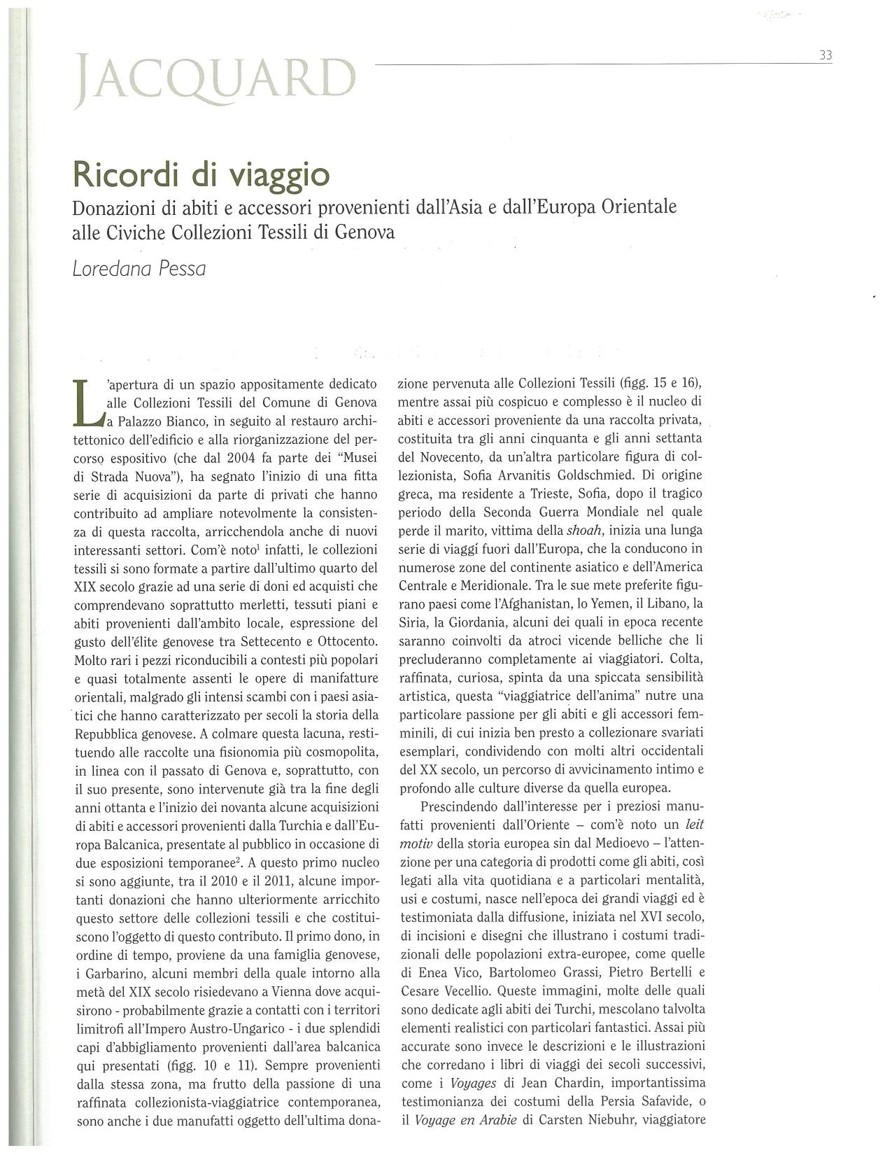 In the issue we have the discovery of relic-textiles dating back to the late ancient and medieval periods. The parade of heroes and heroines in the frescoes of the Manta castle attracts attention due to the fabrics depicted and the comparisons with the remaining examples of the time. Moving to China, the evolution of the art of embroidery has changed techniques and uses over the centuries. The theme of travel is the common thread that links clothes and accessories from Asia and Eastern Europe and donated to the Civic Textile Collections of Genoa. The "unusual" section includes two particular pieces: a gold-embroidered chasuble from the early 19th century and an embroidered handbag from the late 1800s with a "surprise". The notes on the textile design conducted in the Lisio Foundation concern a multiple fabric made with a digital loom, while the artist Maria Luisa Malerba presents her works that express the colors of the sea. Closing are the characters of fairy tales told in felt and fantastic little animals born from a lively imagination and a strong sensitivity for the recovery of materials.