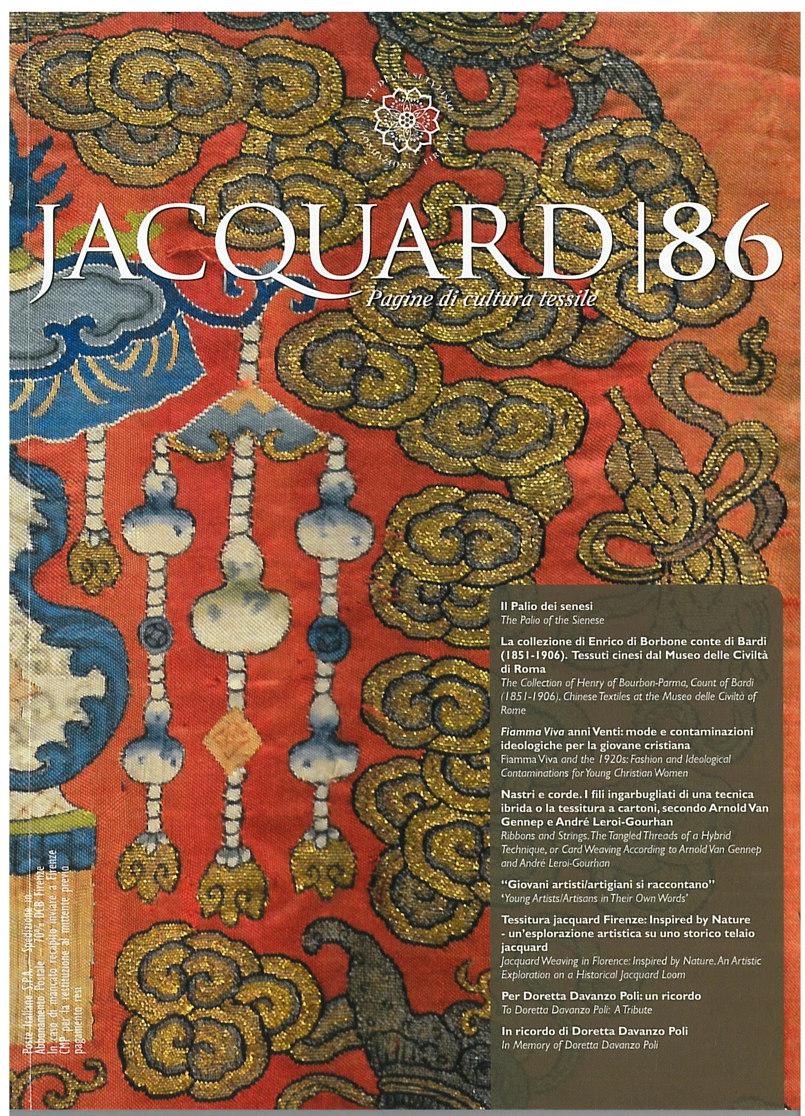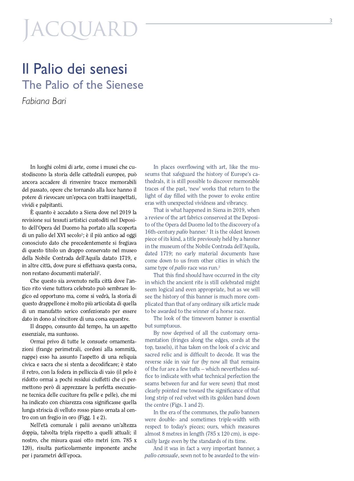 This issue opens with a 16th-century palio banner sewn of solid-colour cut velvet, conserved at the Museo dell’Opera del Duomo in Siena. These creations can be sorted according to function as awards and as votive offerings; their history, documentary and material evidence, and comparisons combine to help us understand their importance in the past and in terms of what they still represent for the city.