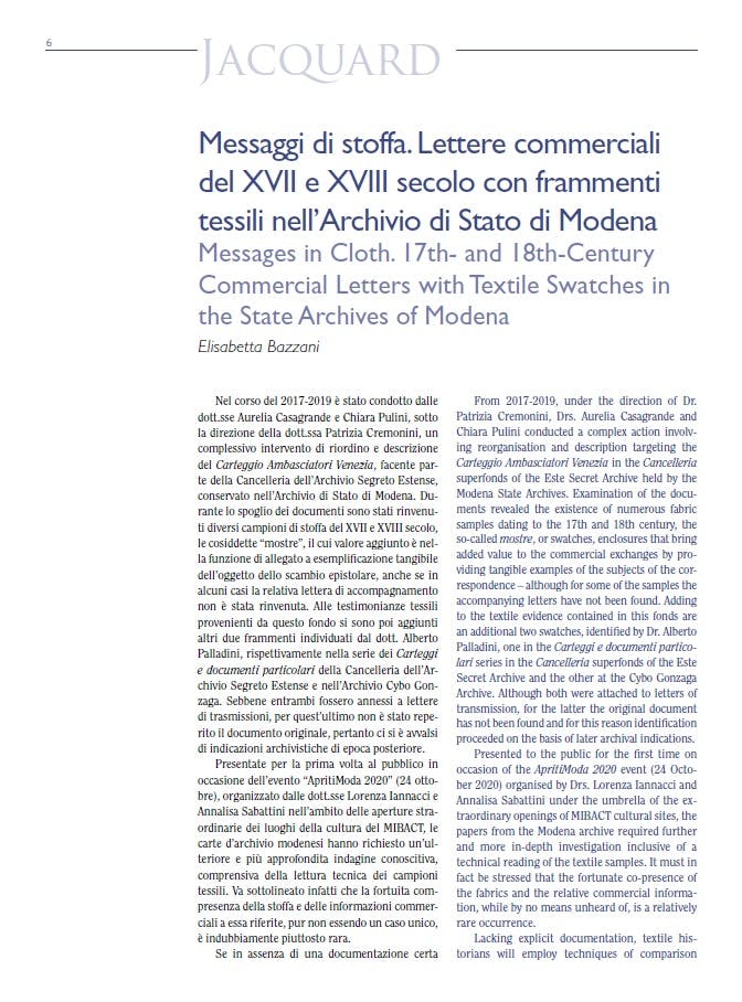 The first examines a number of 17th- and 18th-century commercial letters which have come down to us complete with fabric swatches from the State Archives of Modena. Such documentation – with textile samples providing tangible examples of what was in vogue at the dates of the letters and offering visual cues to deciphering the terminology used in the letters – is both extremely rare and an important tool for scholars of antique fabrics.