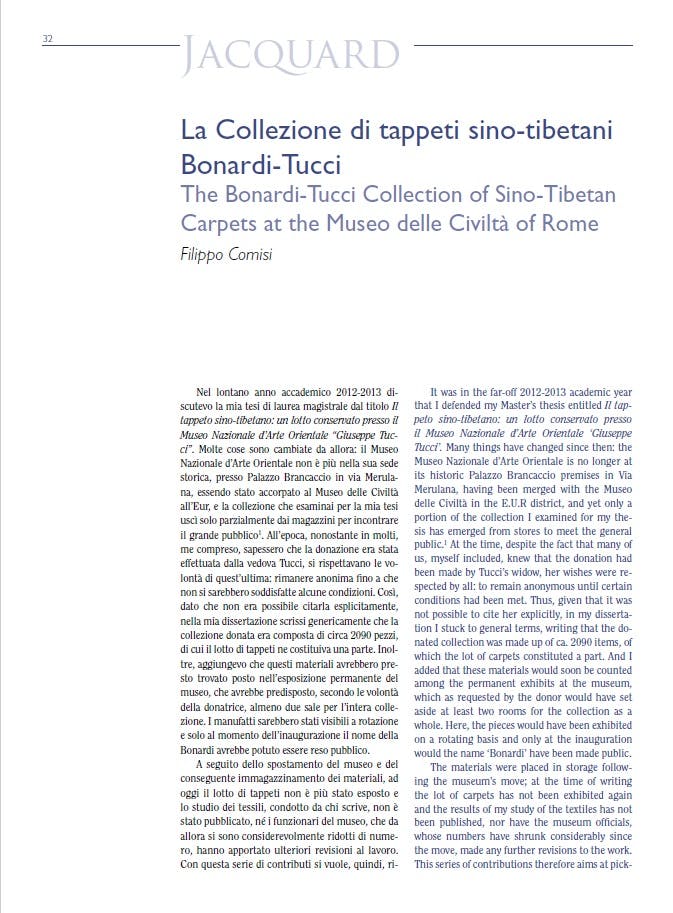 There follows an essay on the precious nucleus of Sino-Tibetan carpets in the Bonardi-Tucci Collection held by the Museo delle Civiltà of Rome, in which we learn how the collection came to be and much about the technical and stylistic characteristics and the manufacture of these products of the Far East.