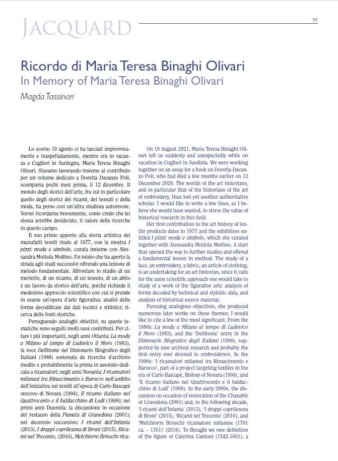 And finally, a few words to remember well-known scholar Maria Teresa Binaghi Olivari, who contributed so greatly to research and discussion on textiles and on embroidery in particular.