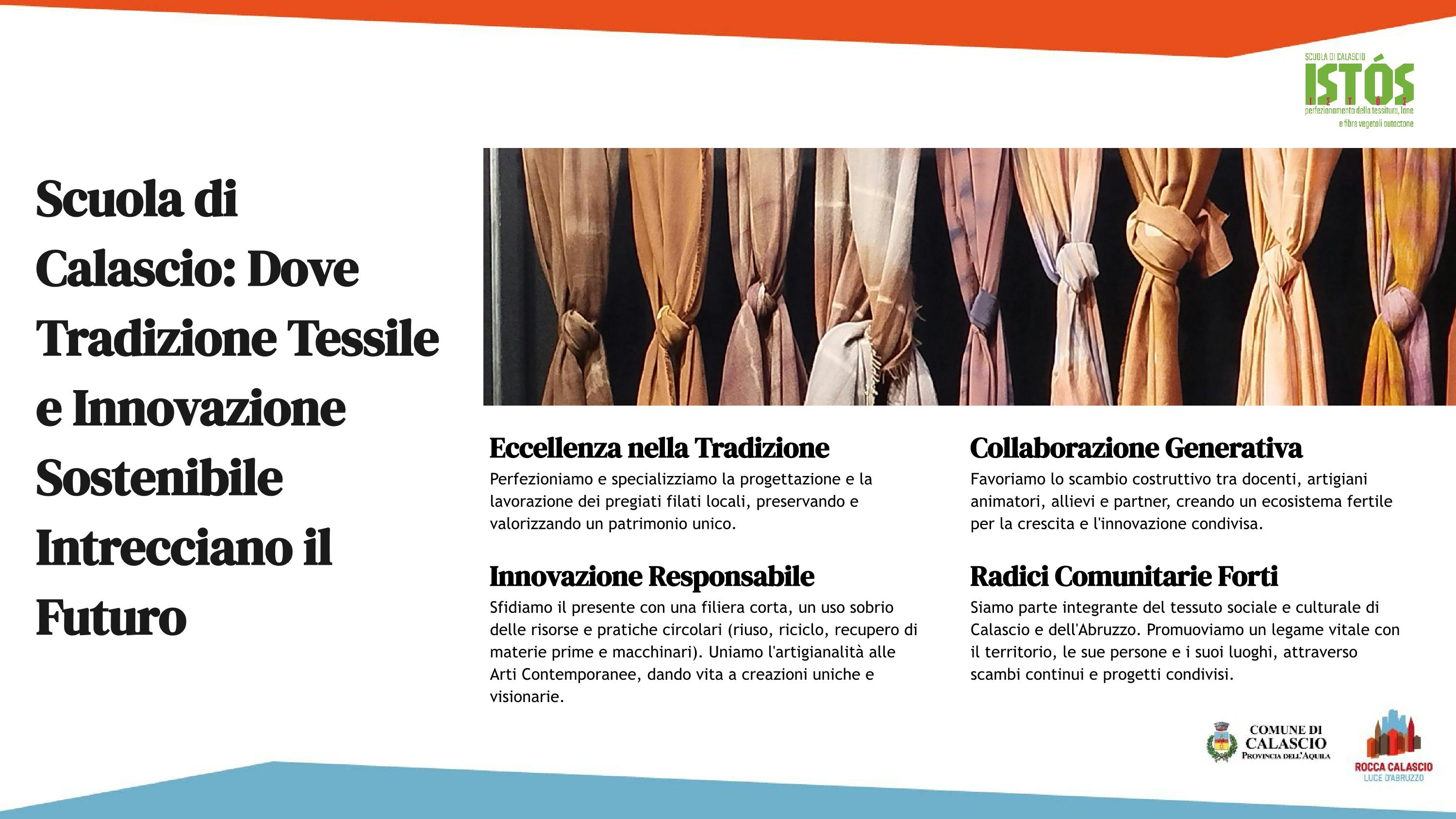 ISTOS is the pilot project of the “Scuola di Calascio per il perfezionamento della tessitura, lane e fibre vegetali autoctone”, born as part of the cultural, social and economic regeneration project of the town of Calascio, “Rocca Calascio Luce d'Abruzzo”, financed with PNRR M1C3 MISURA 2 funds “RIGENERAZIONE DI PICCOLI SITI CULTURALI, PATRIMONIO CULTURALE, RELIGIOSO E RURALE” - INVESTIMENTO 2.1. “ATTRATTIVITÀ DEI BORGHI STORICI” CUP I24H22000520001.