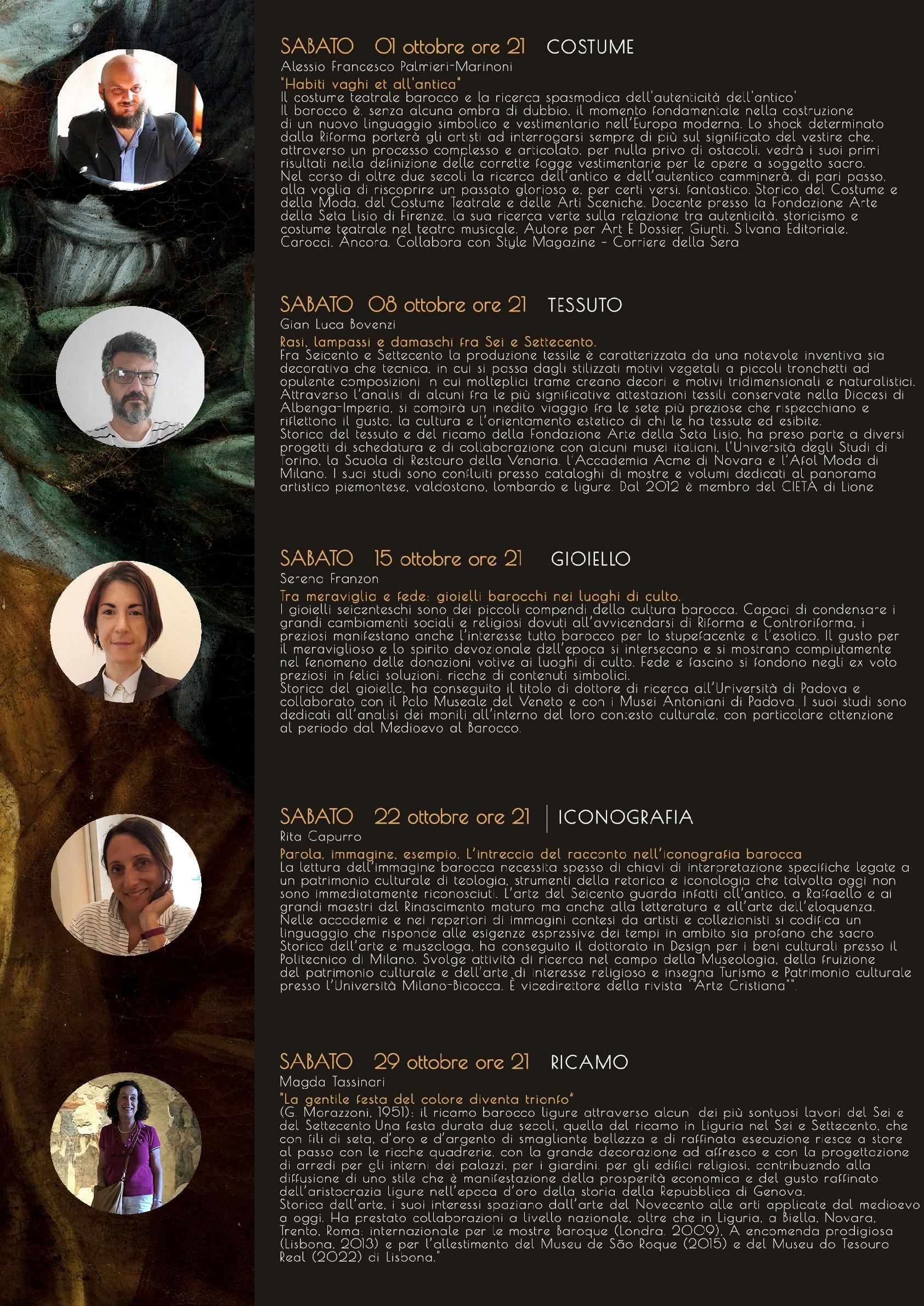 Attraverso l’analisi di alcuni fra le più significative attestazioni tessili conservate nella Diocesi di Albenga-Imperia, si compirà un inedito viaggio fra le sete più preziose che rispecchiano e riflettono il gusto, la cultura e l’orientamento estetico di chi le ha tessute ed esibite.