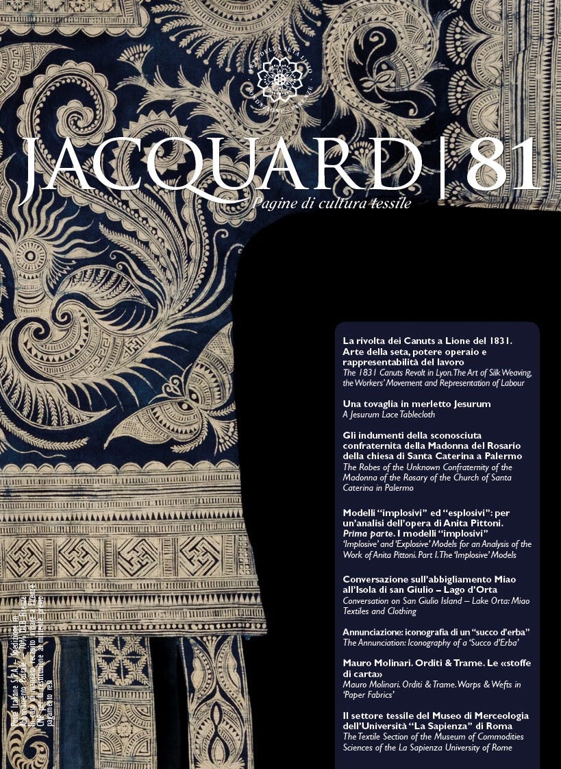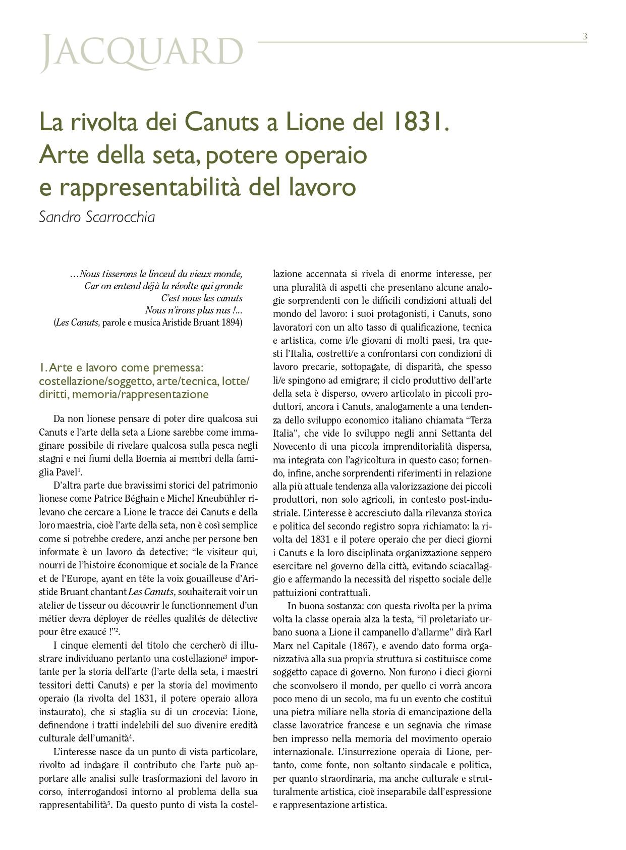 Un saggio importante sulla rivolta dei Canuts a Lione del 1831 apre questo numero piuttosto ricco ed eterogeneo nei contenuti. Al centro dello studio, i Canuts, ovvero i tessitori lionesi che hanno fatto della loro città un centro tessile straordinario, nato per impulso di Luigi XI con l’apporto dei maestri tessitori fiorentini e diventato modello produttivo con caratteristiche organizzative, tecniche, tecnologiche e artistico/creative di importanza internazionale. La rivolta segna il punto di svolta nella consapevolezza e nell’affermazione dei diritti legati al lavoro.