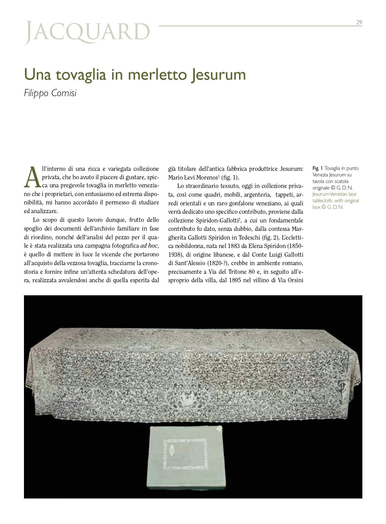 Una ricca tovaglia in merletto veneziano Jesurum con le sue vicende legate alle diverse acquisizioni, ma soprattutto con la sua straordinaria fattura, ci porta nel mondo delle merlettaie e delle loro abilità nel rendere una complessa ideazione nei soggetti e nella composizione.
