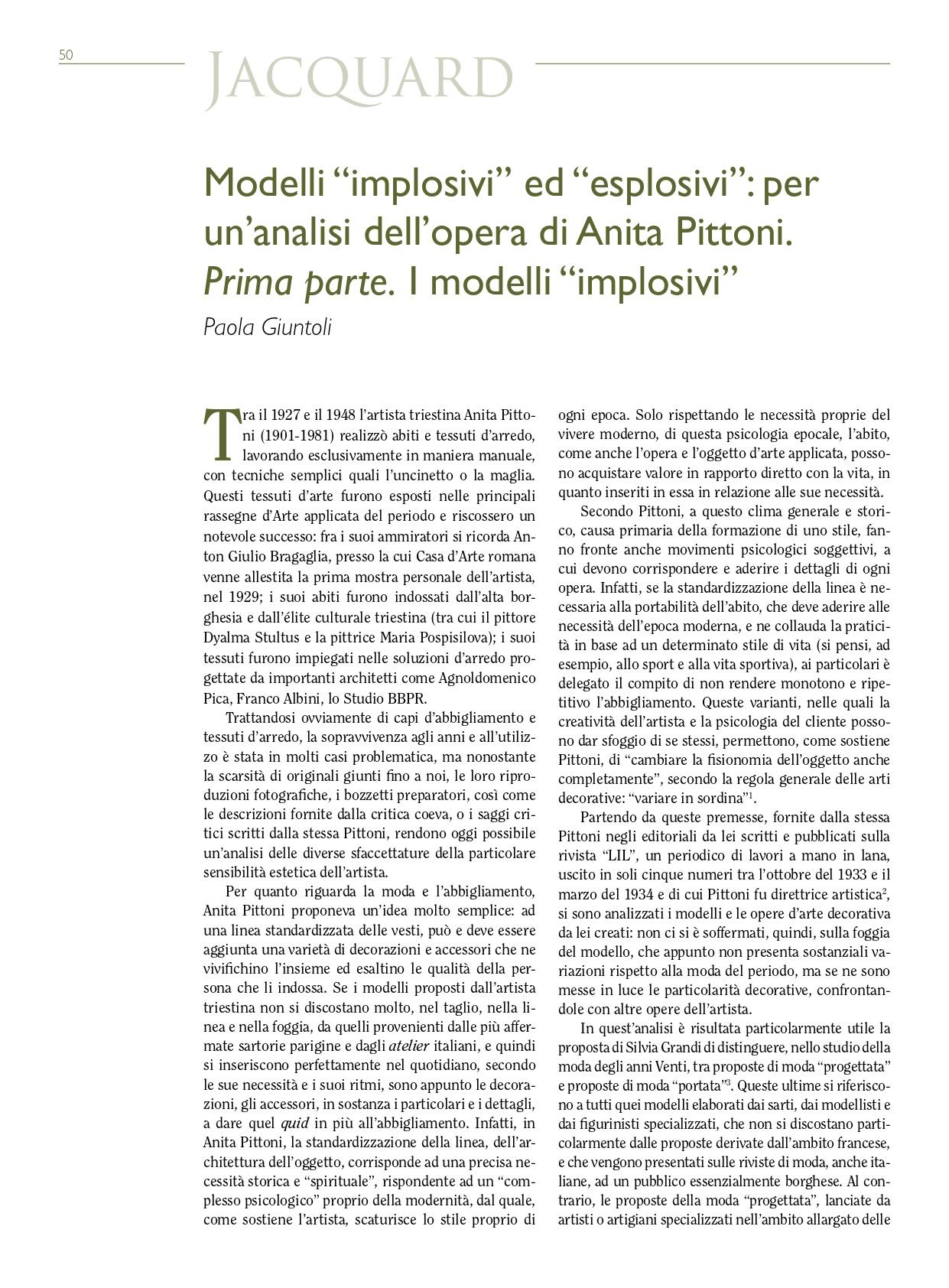 Poi da questi esemplari del XIX secolo andiamo a esaminare opere novecentesche come quelle di Anita Pittoni che creò tessuti e abiti tra il 1927 e il 1948 secondo lo stile dell’epoca, seguendo le necessità e i ritmi del quotidiano. In questa prima parte dello studio vedremo i modelli “implosivi” cioè quelli che guardano il passato in linea con le proposte storicistiche sviluppate anche nell'ambito delle arti applicate.