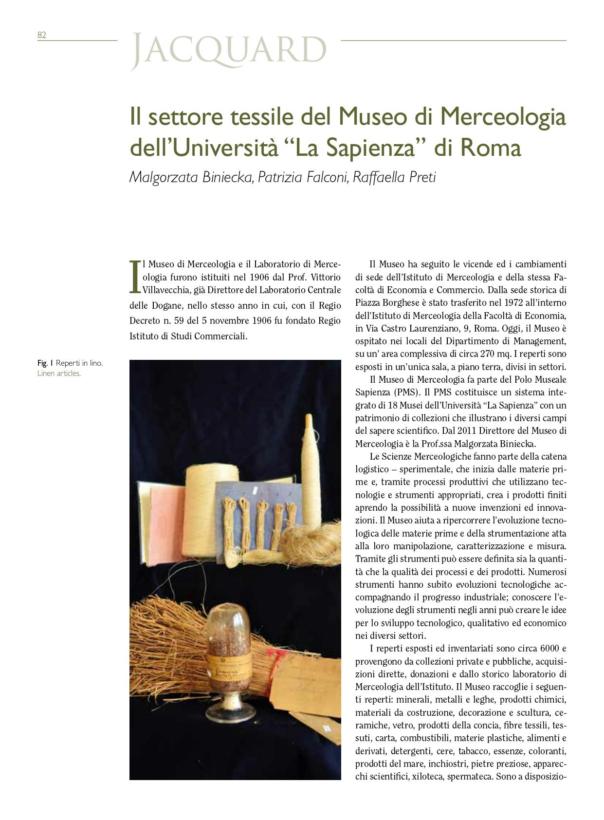 Ancora pittura, ma questa volta acquarelli su carta con la visione tutta moderna delle tipologie decorative distese sui tessuti auroserici antichi e interpretati dall’artista Mauro Molinari nelle sue opere. Infine a chiudere, una visita che sicuramente vale la pena di fare di persona, al Museo di Merceologia dell’ Università “La Sapienza” di Roma con un notevole patrimonio di collezioni grazie alle quali si ripercorre l’evoluzione tecnologica delle materie prime e della strumentazione destinata alla loro manipolazione, caratterizzazione e misura.